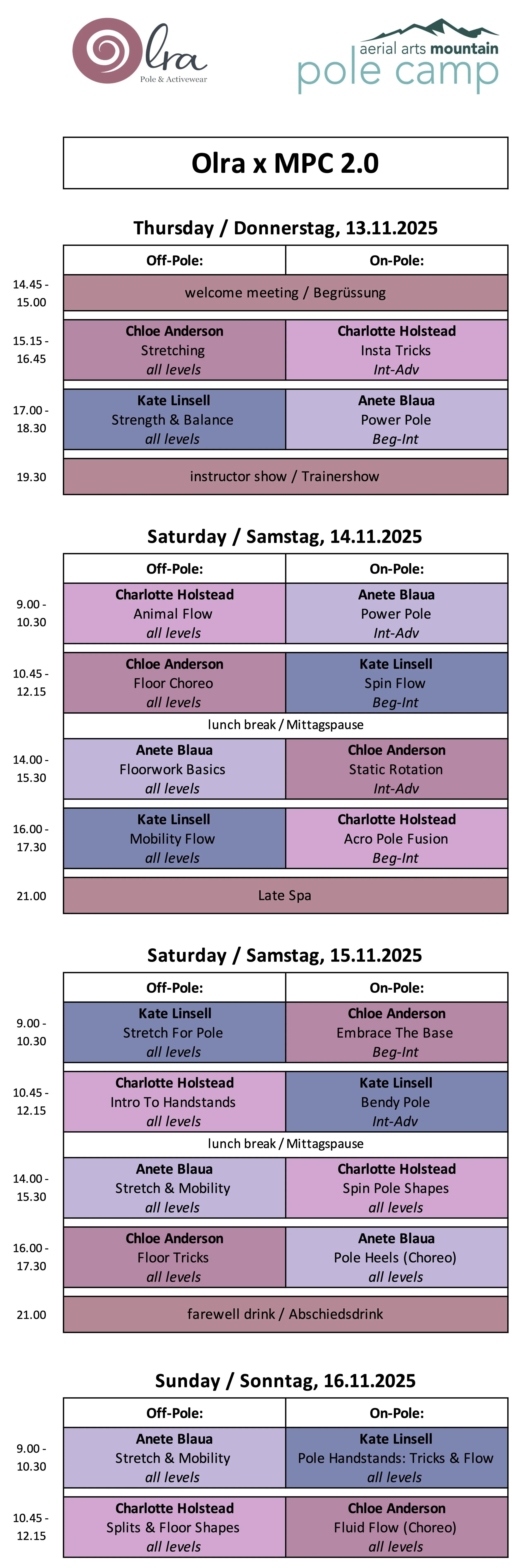 As part of this camp you will get 4 days of workshops to enjoy with some of your favourite Olra Ambassadors. We will also be able to enjoy some relaxed evenings spent together socialising, hitting the spa and eating lots of amazing food. All classes are 1.5 hours and we have various levels of pole classes for you to choose from as well as off the pole classes. There is something for everyone!